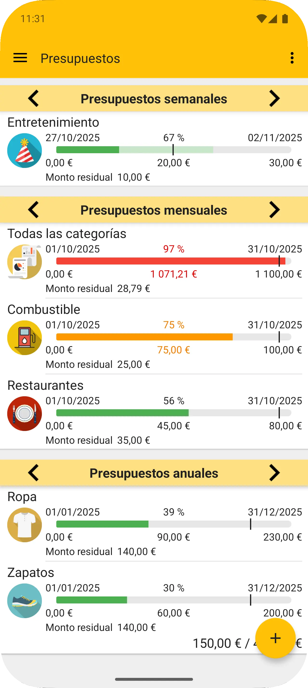 Establece límites de gasto para diferentes categorías, sigue tu progreso en tiempo real y recibe alertas antes de gastar de más.