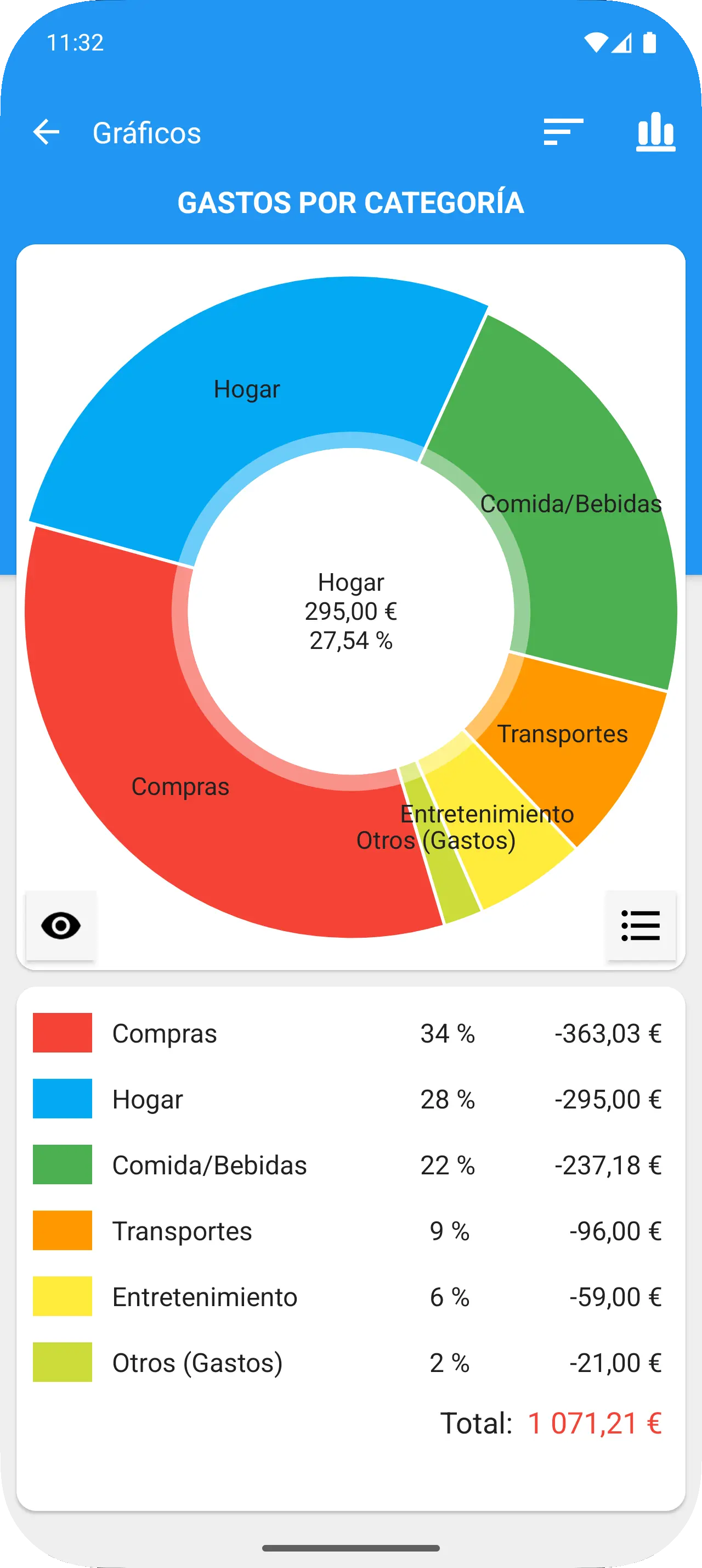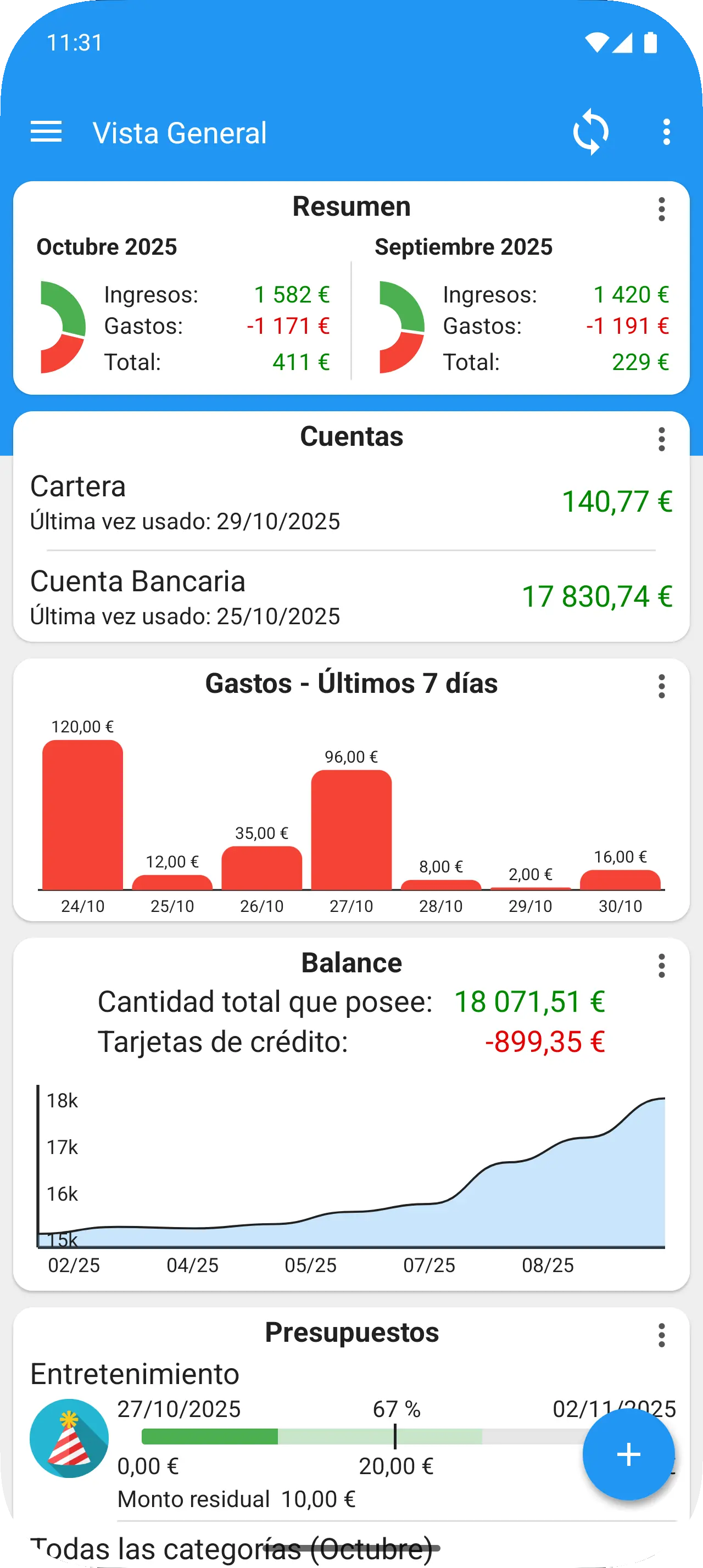 Fast Budget proporciona una visión general personalizable de tus ingresos, gastos y presupuestos en una sola pantalla. Nuestros informes y gráficos intuitivos facilitan la comprensión de tus hábitos de gasto e identifican áreas de mejora.