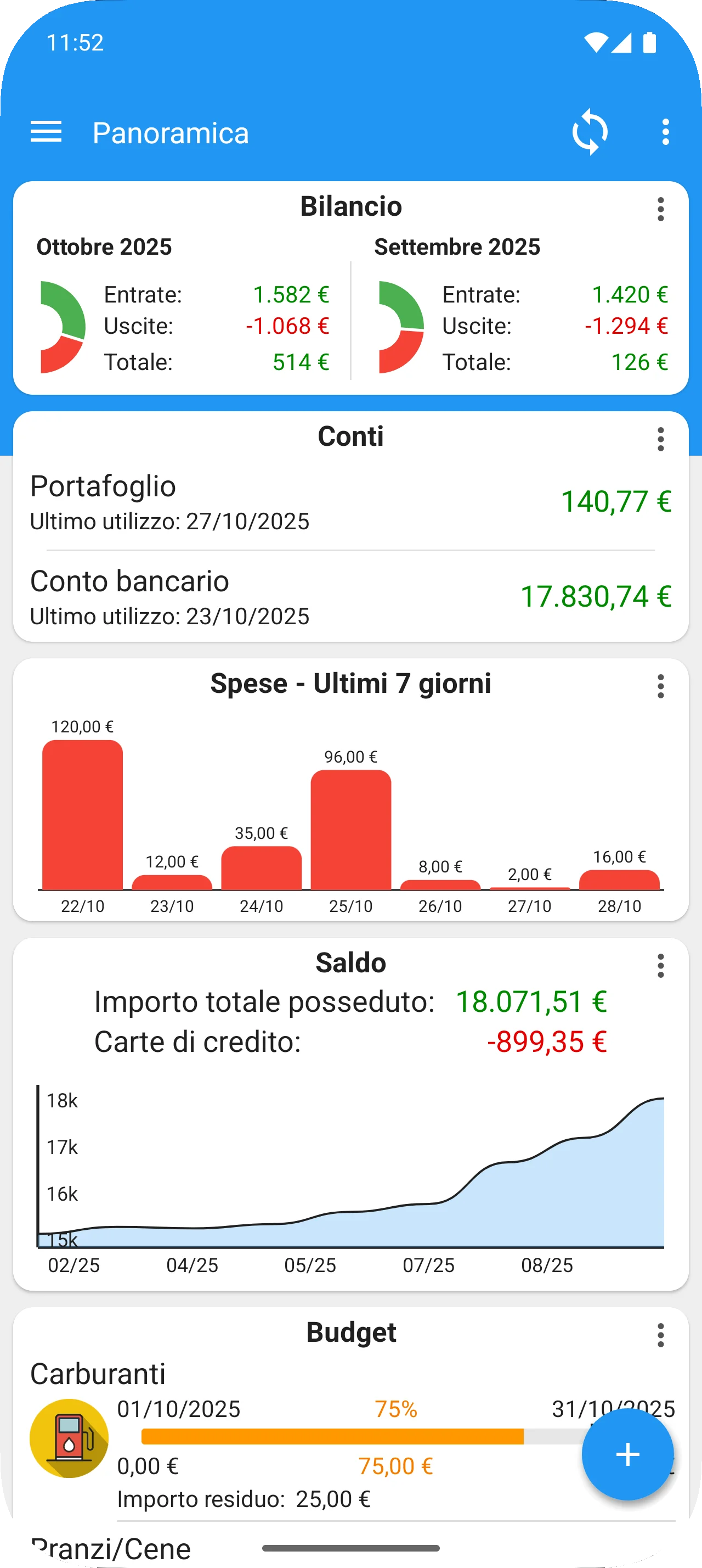 Fast Budget offre una panoramica personalizzabile di entrate, spese e budget in un'unica schermata. I nostri report e grafici intuitivi ti rendono facile capire le tue abitudini di spesa e identificare le aree di miglioramento.